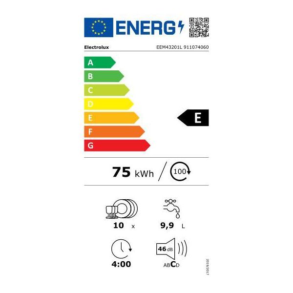Myčka nádobí Electrolux EEM43201L je vestavěný spotřebič, který vám ušetří spoustu času, práce, a hlavně energie při mytí nádobí. Bez problémů na jeden mycí cyklus pojme 10 sad nádobí, snadno se tedy zbavíte všeho špinavého nádobí naráz i v početnější rodině. Se svou šířkou 44,6 cm, výškou 81,8 cm a hloubkou 55 cm jistě nalezne místo ve vaší kuchyňské lince. O nastavení myčky a stavu mycího cyklu vás bude informovat displej, který je součástí ovládacího panelu. Spotřebič spadá do energetické třídy E.